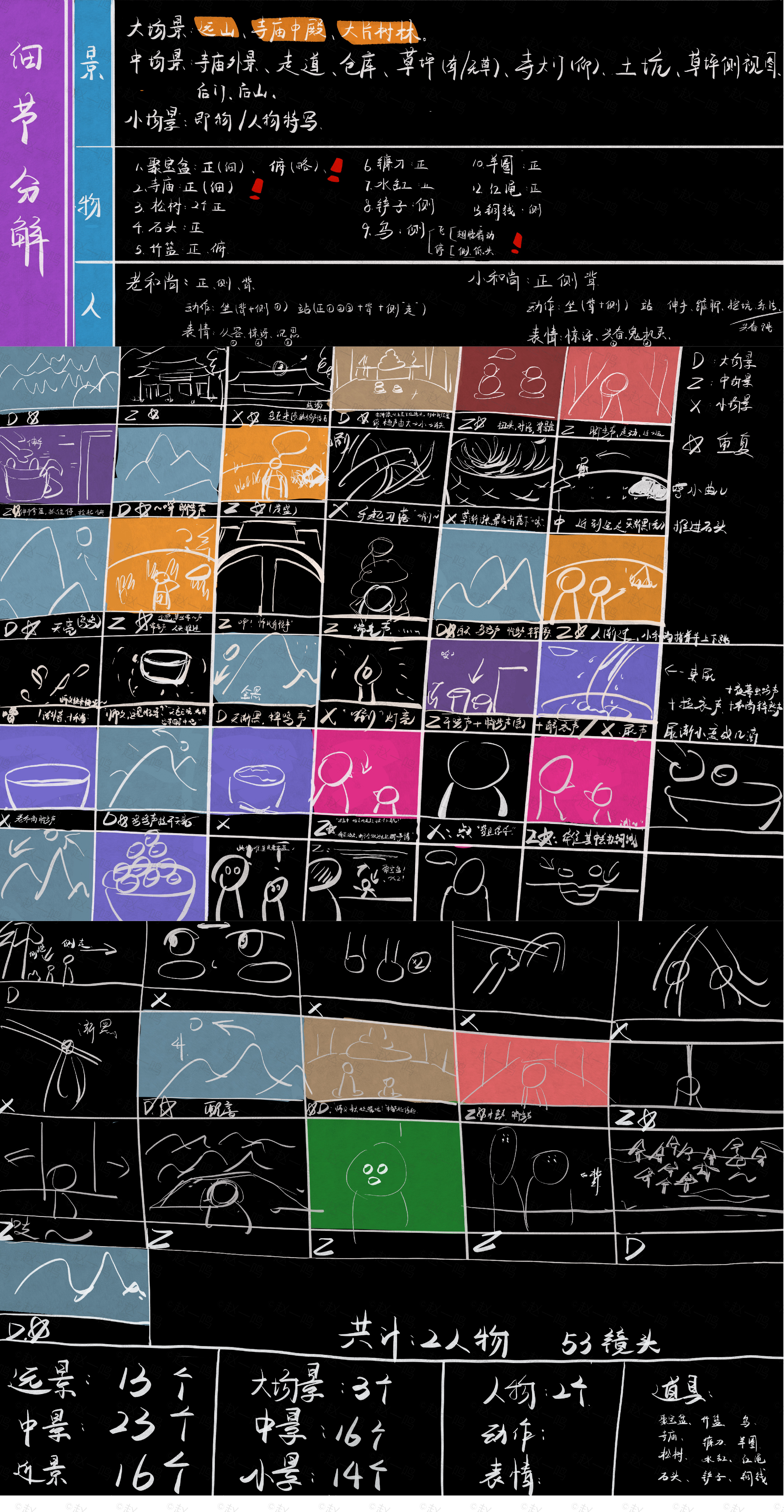 - 视觉风格: 采用国风动画的风格,以契合高山寺庙的背景设定,营造宁静、古朴而富有禅意的氛围。色彩偏向淡雅,但在关键场景(如发现聚宝盆、满山红绳)运用强对比色,以突出视觉冲击力。